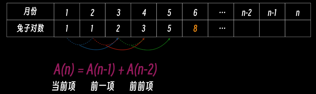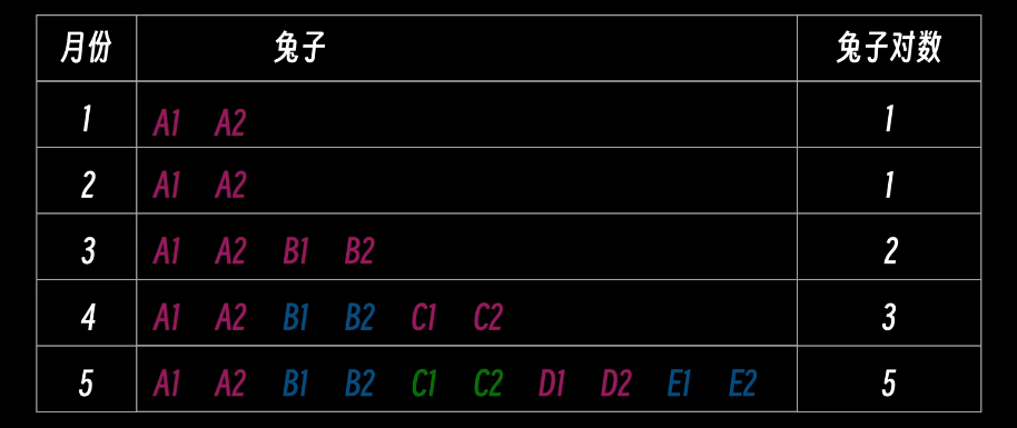 我们只关心每月的兔子对数,列出观察发现其实就是斐波那契数列