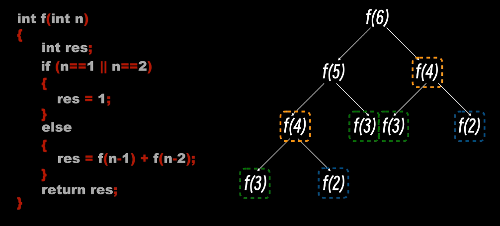 可以看到有很多项在被重复计算着,于是随着求解的项数越多,程序执行的效率也就越低,于是我们可以不使用递归,每一次只用计算一遍便可提升执行效率