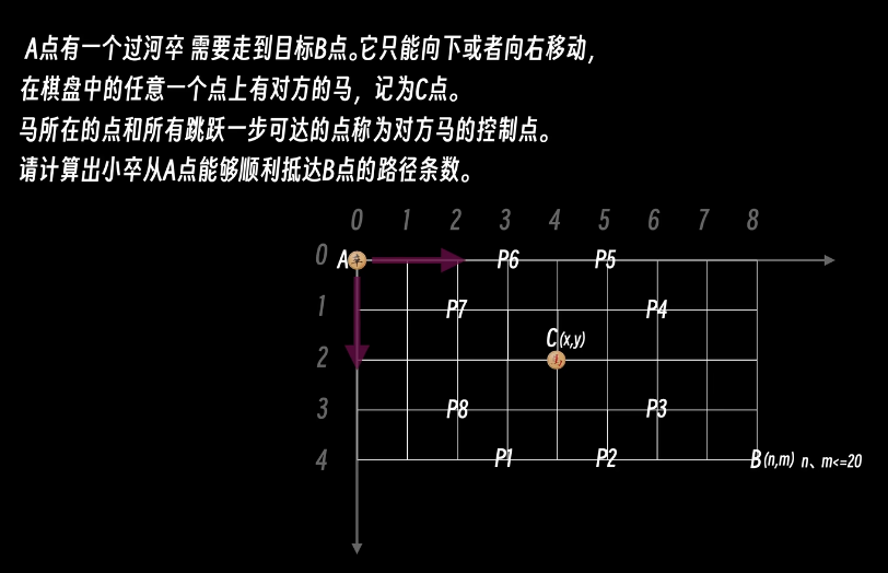 以上只完成了没有马的情况下到达 B 点的路径条数,还需将马所在的 C 点及马的控制点 P 筛选出来