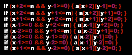 但是如果当有任意一个马的控制点 P 占据了第 0 行和第 0 列的位置,就不能之间将第 0 行和第 0 列标记为 1 了,因为会被 P 点阻挡