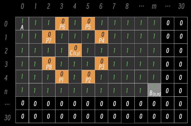 我们可提前将整个 B 点所在的表格中数组标记为 1 再将 C 点及 P 点数组的值标记为 0,需要注意