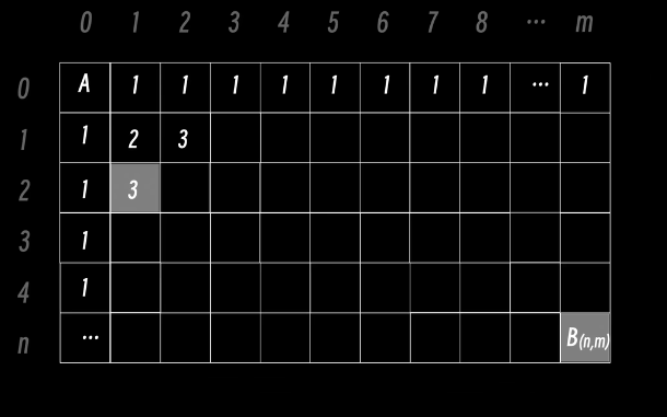 分析可得,当 B 在中央时,路径条数总数是到达 B 所在位置上方和所在位置左方路径条数相加所得。想要知道到达上边或者左边的路径数就需要知道更上边或者更左边的路径数,可用递推表示。